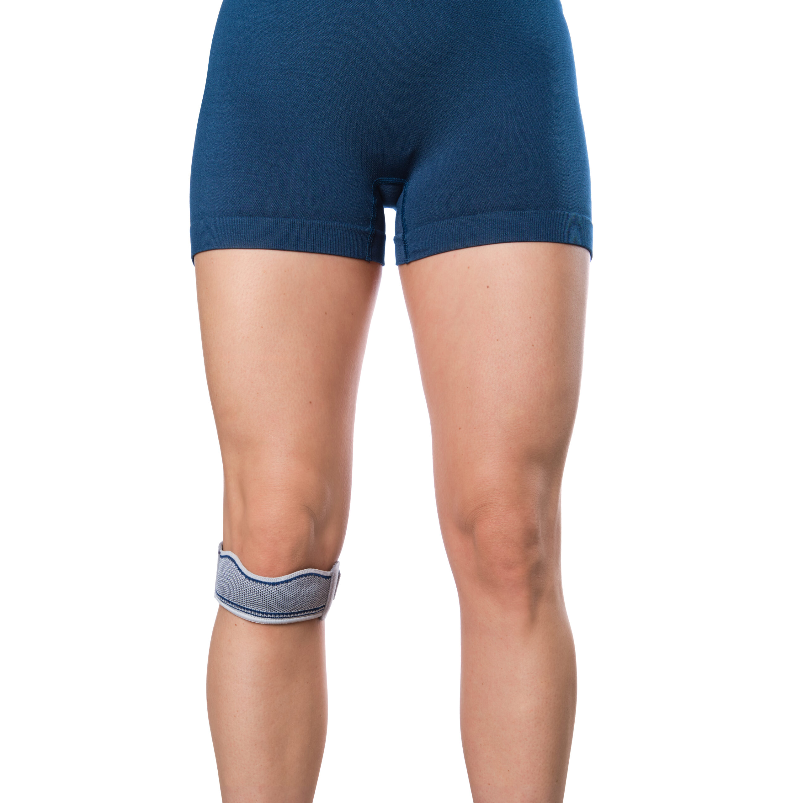 2. Plaats de band rond de knie, met de gelpelotte direct onder de knieschijf. Zorg dat de uitsparing naar boven wijst richting de patella.
